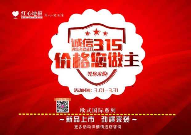 3月伊始,春回大地。隨著全國天氣的轉暖,國內建材市場也即將開始又一輪的競爭狂潮。紅心地板率先為今春帶來一股暖流!今年3?15紅心突出“誠信、專業(yè)、奉獻”,通過品質升級、服務升級、禮品升級來承載升級消...