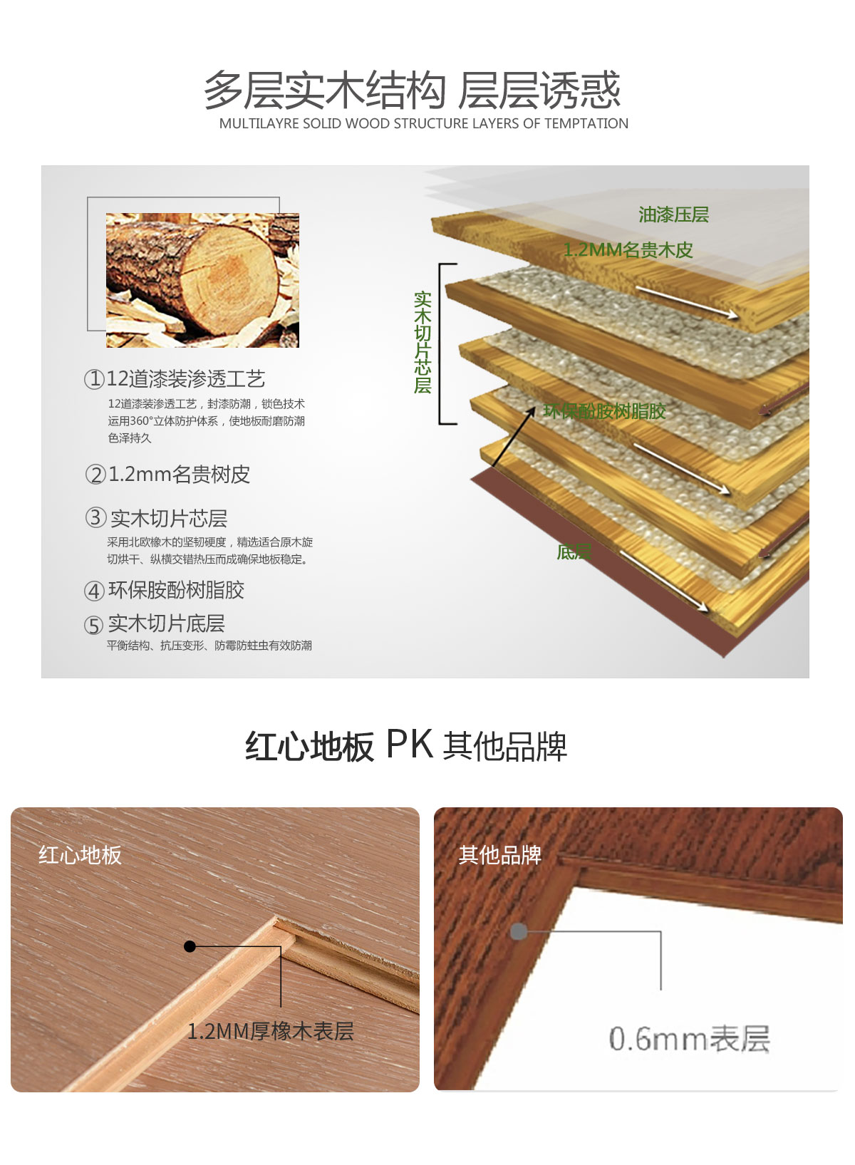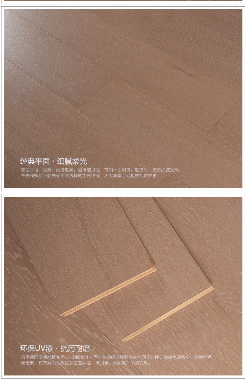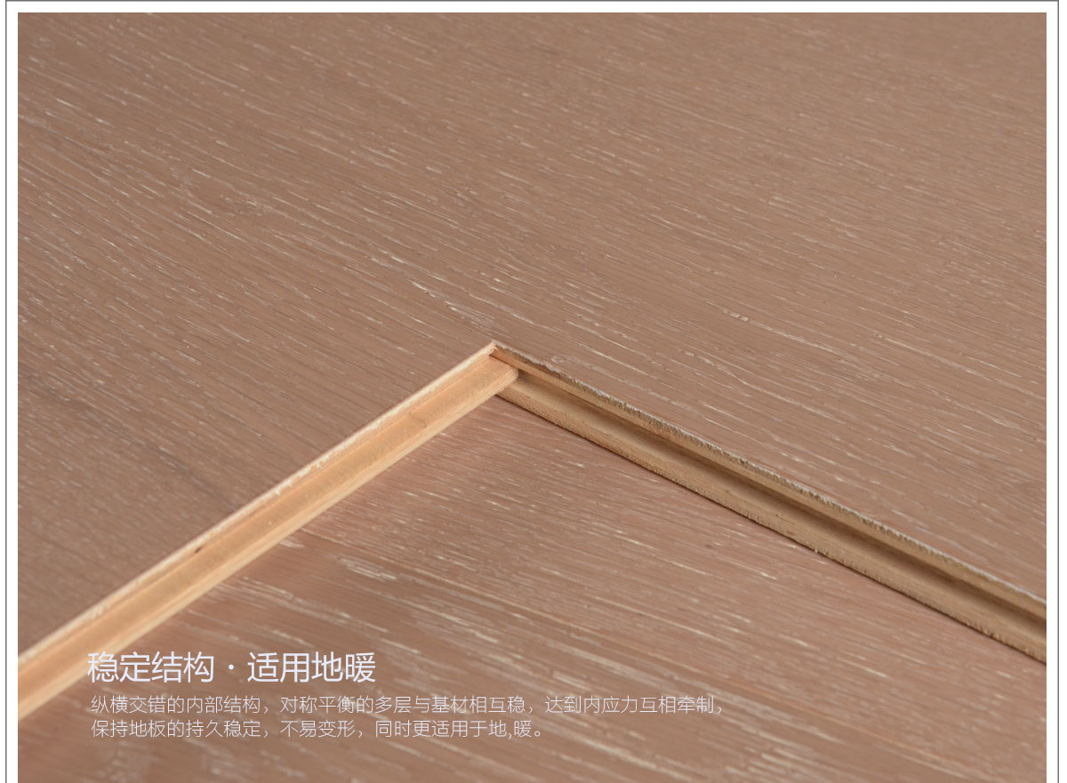 多層實木層層誘惑,1.2MM珍貴原木面層。橡木紋理呈現(xiàn)原木質(zhì)感,在實用上倍感舒適,能起到防滑和腳底按摩的作用。表面平坦、細膩柔光 耐磨度高,在自然光下能展現(xiàn)自然流暢的木質(zhì)紋理,大大豐富了地板的視覺效果。